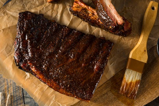 - Colocamos las costillas de cerdo en la freidora de aire y con un pincel de cocina cepillamos la mitad de la mezcla de salsa barbacoa y miel sobre las costillas.